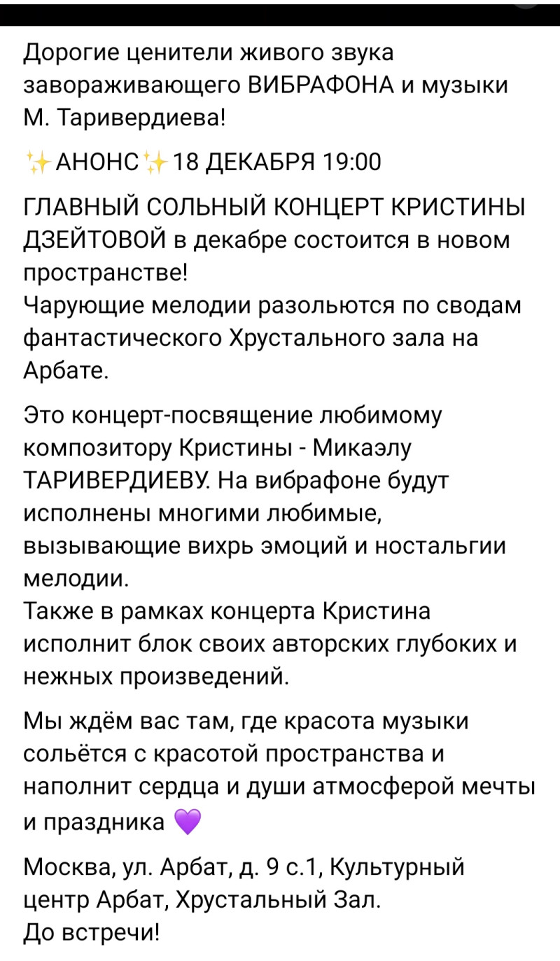 Да, Кристина Дзейтова приглашает на концерт. Вибрафон прекрасно создаёт настроение накануне Нового года и Рождества.