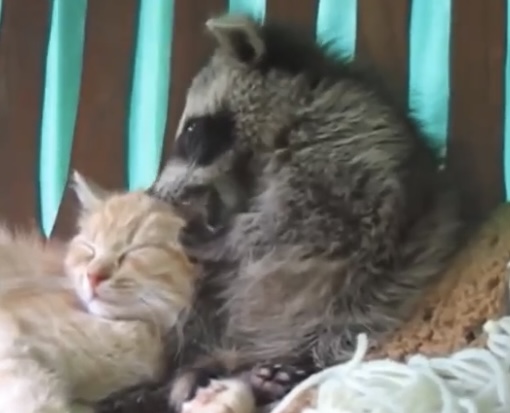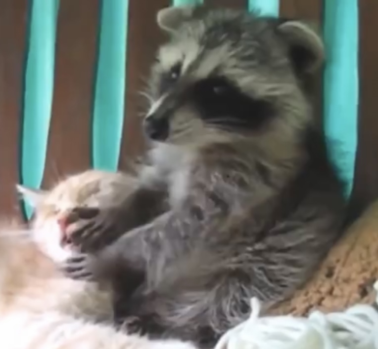 А в реале настоящий Енот умеет и кошечкам комплименты нашептывать. Даже в обнимку на диване вместе лежать. И как пример захотелось показать как лапками может «нежно» приласкать.