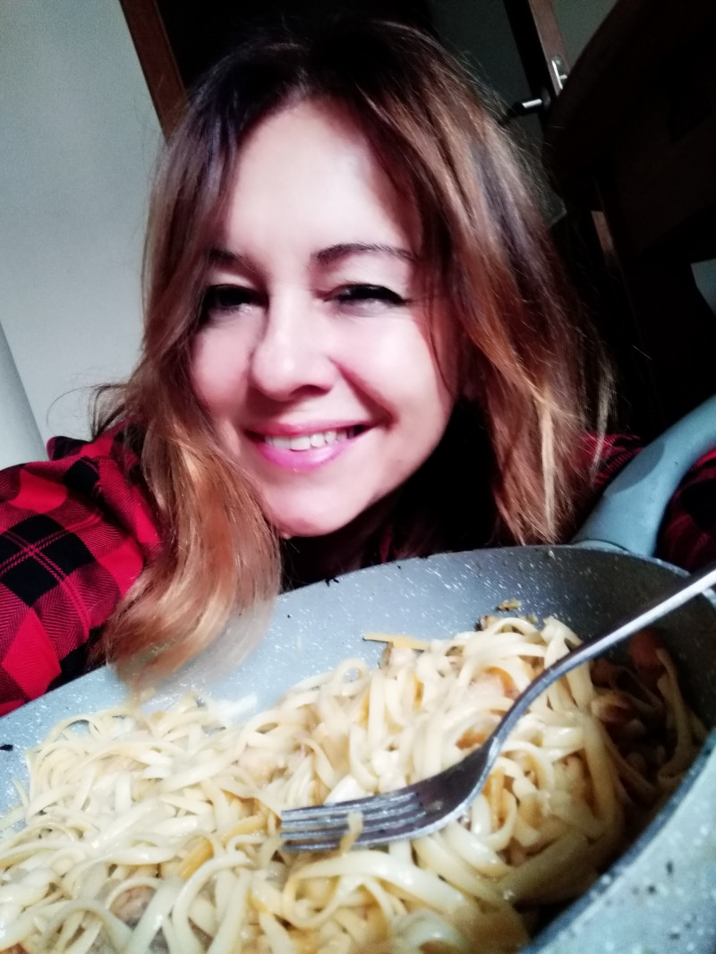 Подмигиваю.На фоне сковородки со спагетти-типа-болоньезе.Даже вилку приготовила