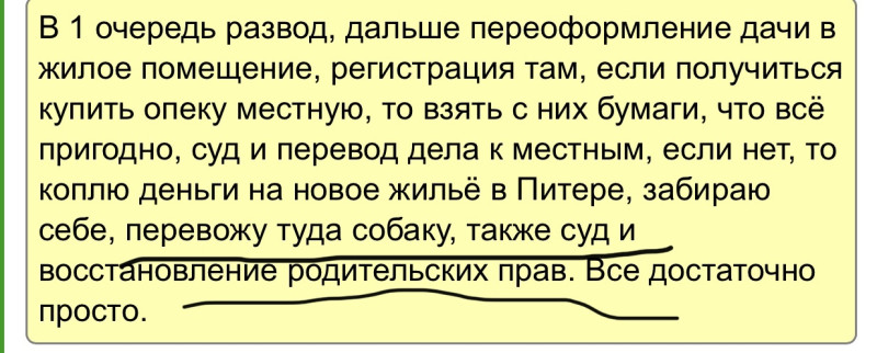 В 1 очередь развод, дальше переоформление дачи в жилое помещение, регистрация там, если получиться купить опеку местную, то взять с них бумаги, что всё пригодно, суд и перевод дела к местным, если нет, то коплю деньги на новое жильё в Питере, забираю себе, перевожу туда собаку, также суд и восстановление родительских прав. Все достаточно просто.