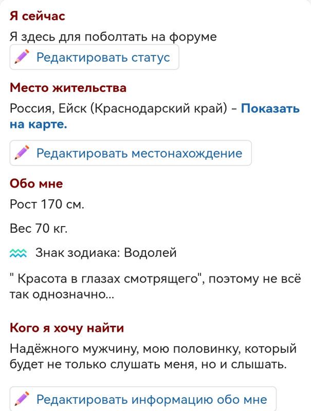 А вообще по жизни (не именно на сайте) я не то что ищу (просто в анкете именно такая формулировка), а была бы очень рада, если бы мне удалось повстречать свою половинку. И если мужчина не будет меня слышать (не слушаться!!!, а понимать что именно я говорю), то это не моя половинка. dntknw_rt_60.gif