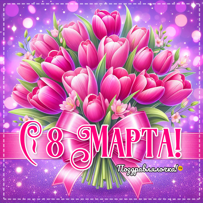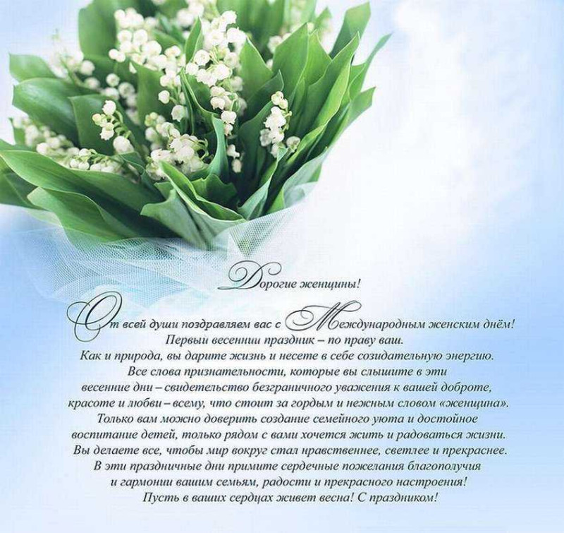 Поздравляю вас с прекрасным весенним праздником — с Днем 8 марта! Желаю огромного счастья, крепкой любви, высоких достижений в жизни и успехов во всем! Чтобы всегда радовали нас своей обворожительной улыбкой и сногсшибательной красотой! Скорейшего наступления весенних деньков и яркого солнышка! Исполнения желаний и ярких положительных эмоций!