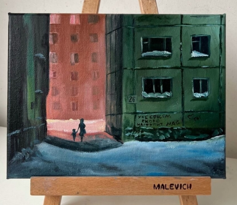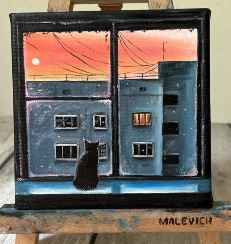 У меня, наверное, самая идиотская, дом, кот и кто-то идёт и видит его и забирает домой, и новая картина будет с тем же пейзажем, может даже зима, но на окне сидит кот, и наблюдает