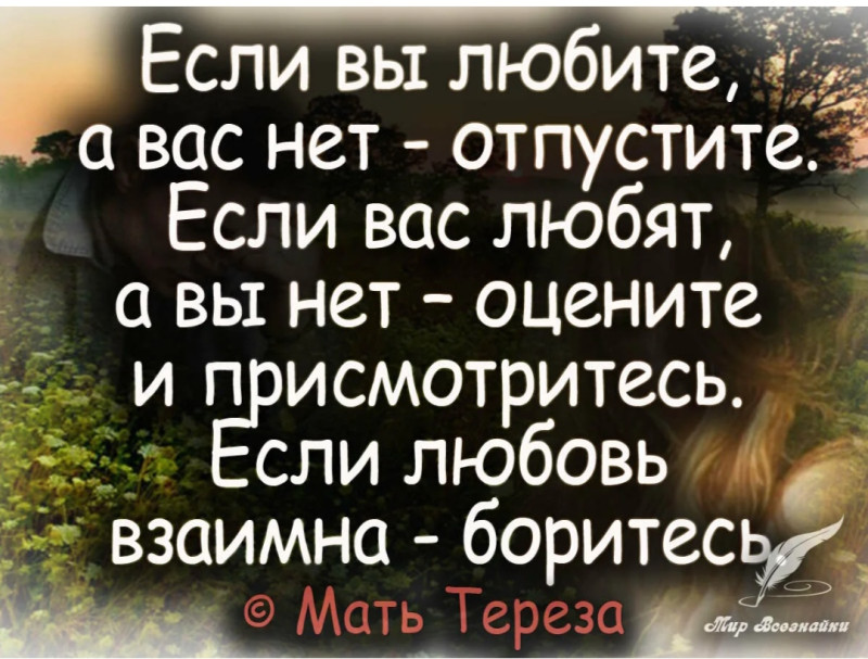 Немножко не так. Когда мой муж, которого я любила ушёл от меня, я понимала что у них любовь. Что это не просто интрижка, это была его первая любовь. И все мне говорили, что я должна бороться, одевать красные стринги и стоять на голове. А я хотела чтобы он был счастлив, а сама просто умерла в тот момент. Воть. Плачу. Никто никому не принадлежит.