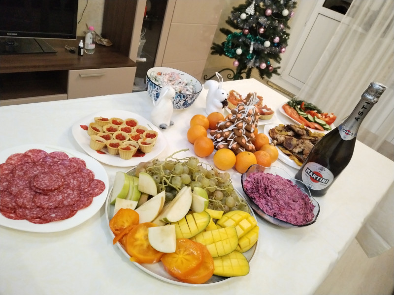 У меня селёдка под шубой, оливье, утиные окорочка в апельсиновом маринаде.