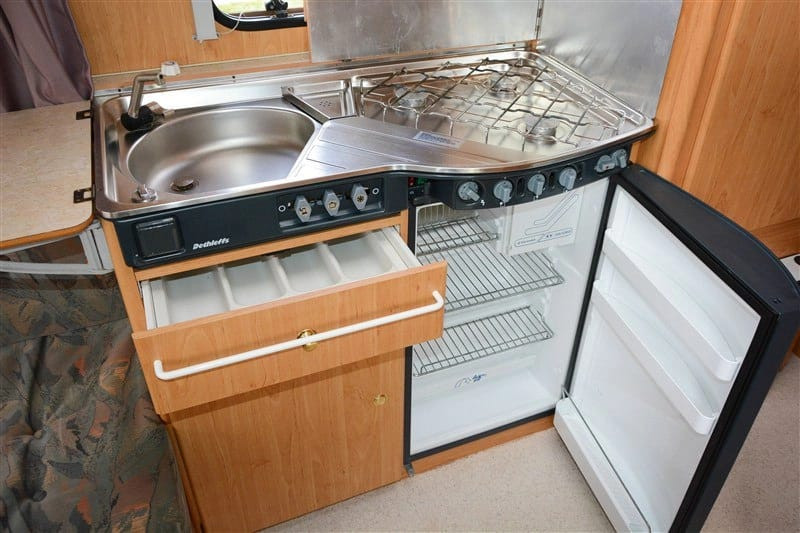 Вот такой кухонный блок в автодроме. Плита , раковина, холодильник и шкаф под посуду