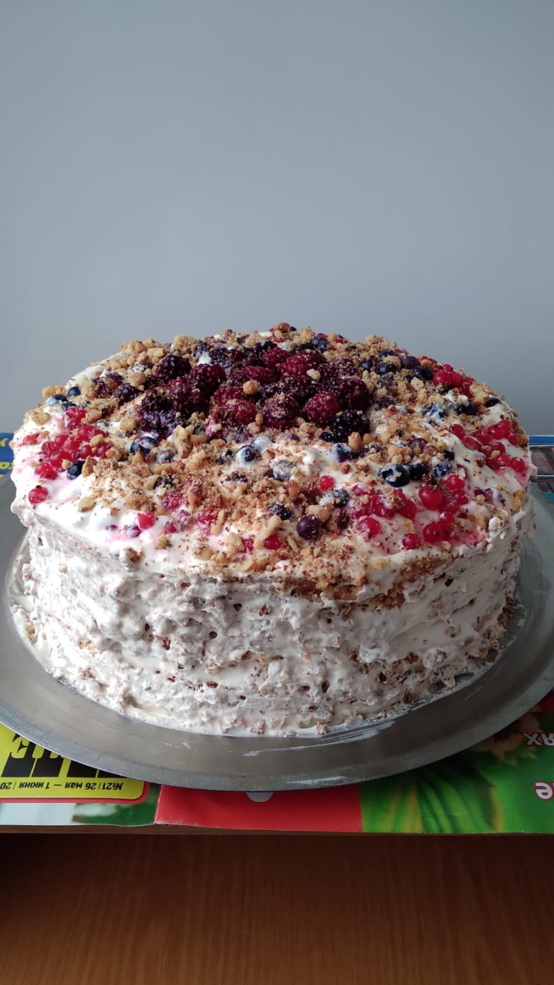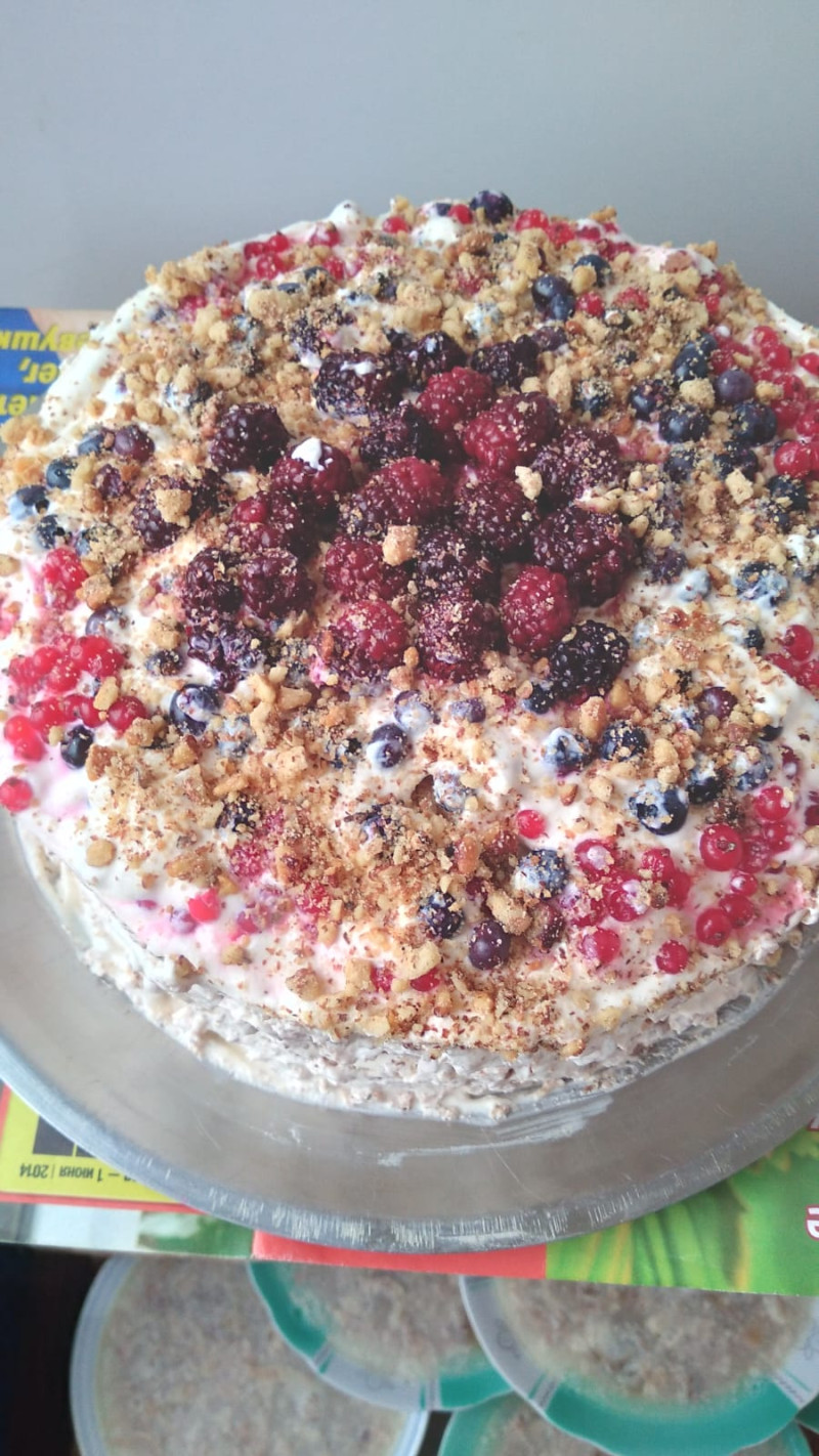 Ягоды, орехи, между пышками тоже много ягод, вместо крема сметана с загустителем.