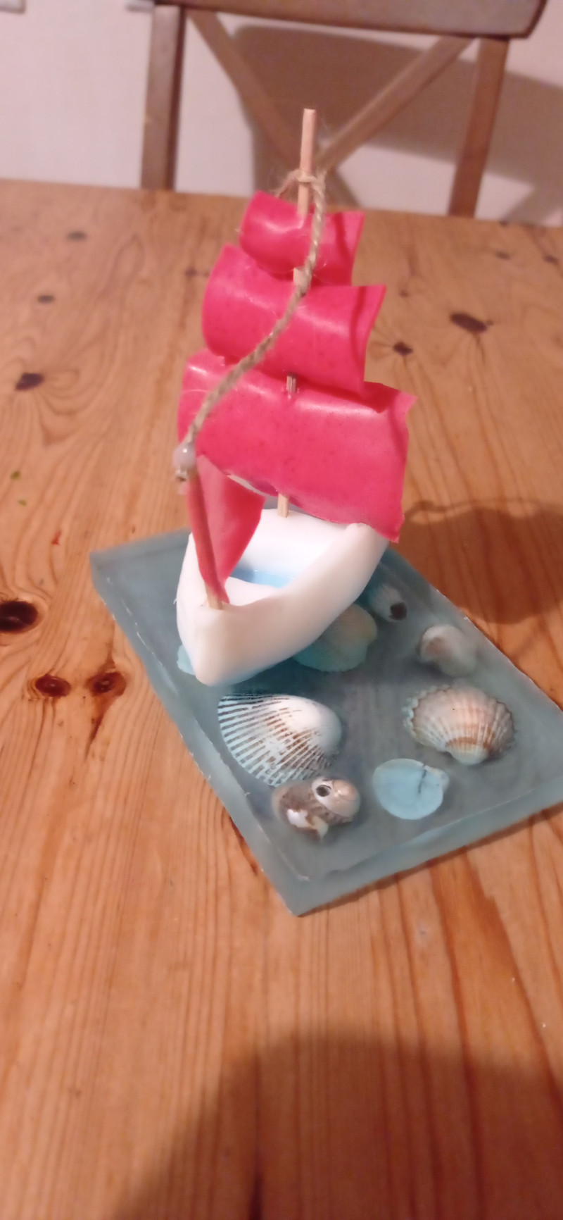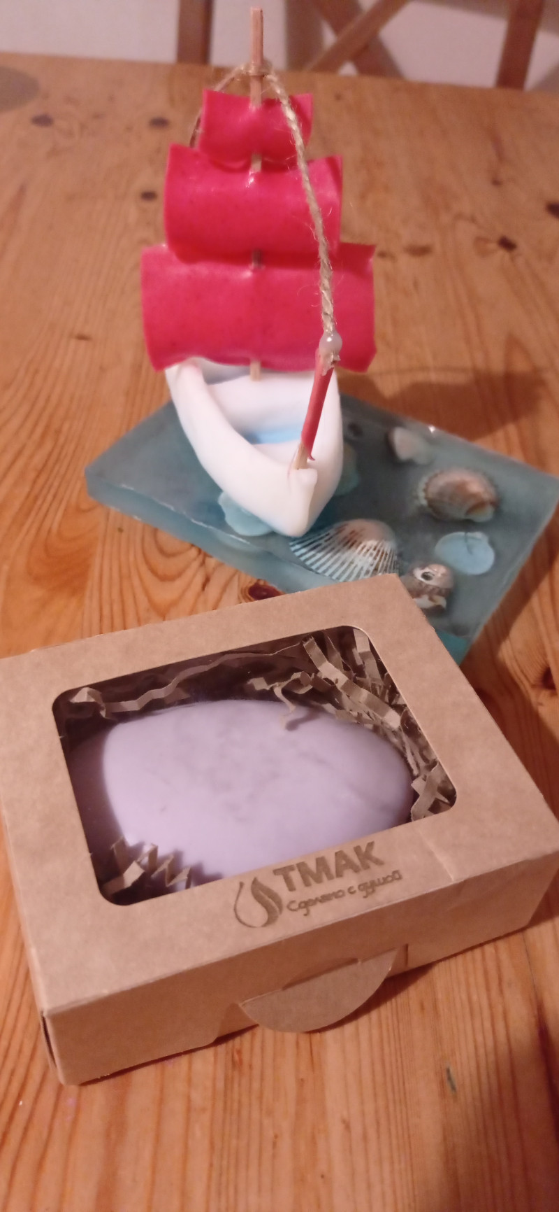 Ну че) Яхта с алыми парусами наконец-то пришвартовалась в порту назначения, в Подольске) Алексей любезно привез её к месту моей работы и передал внутри станции метро. Надеюсь, мой ответный подарок к наступающему ДР Алексея тоже порадует. Дополнительно получила мылко с запахом лаванды, которым будет не жалко попользоваться. Запах очень нежный. Мальчики, если кто не знает, чем порадовать своих дам к 8 марта, рекомендую обратить внимание на работы нашего форумчанина.