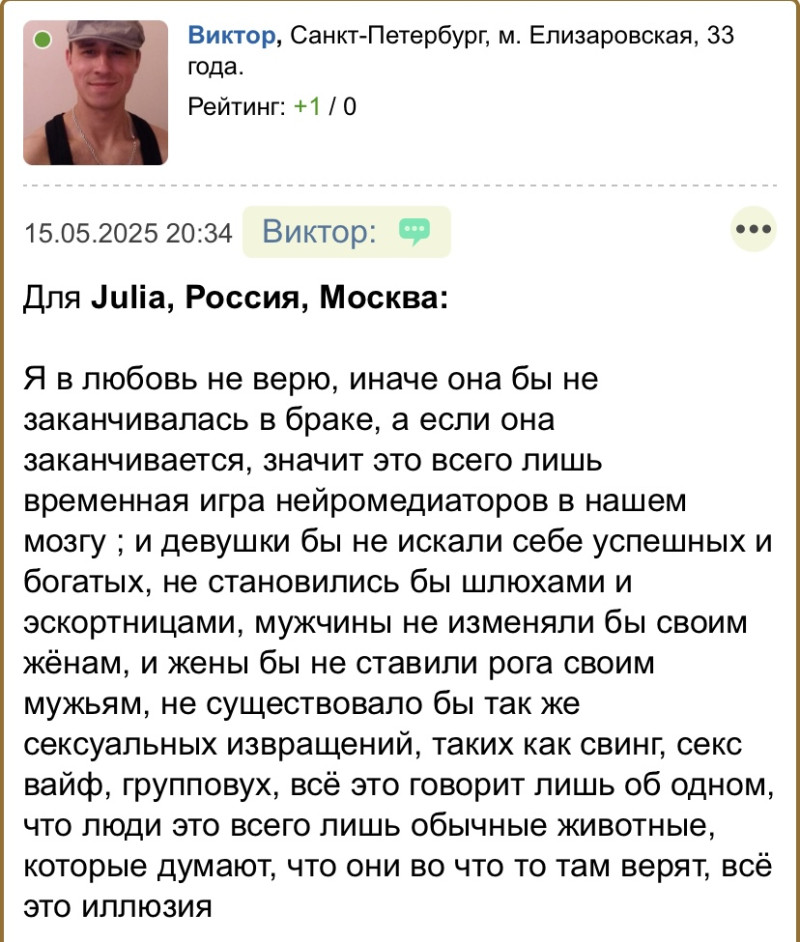 Да пусть они разными будут и отличаться от принятых. Только тон оскорбительный своих поучений и выводов сменит человек. Стоит прочесть какими фразами пришибает в своих постах и получается пишет про то что любви нет и поэтому человечество погрязло в пороках.