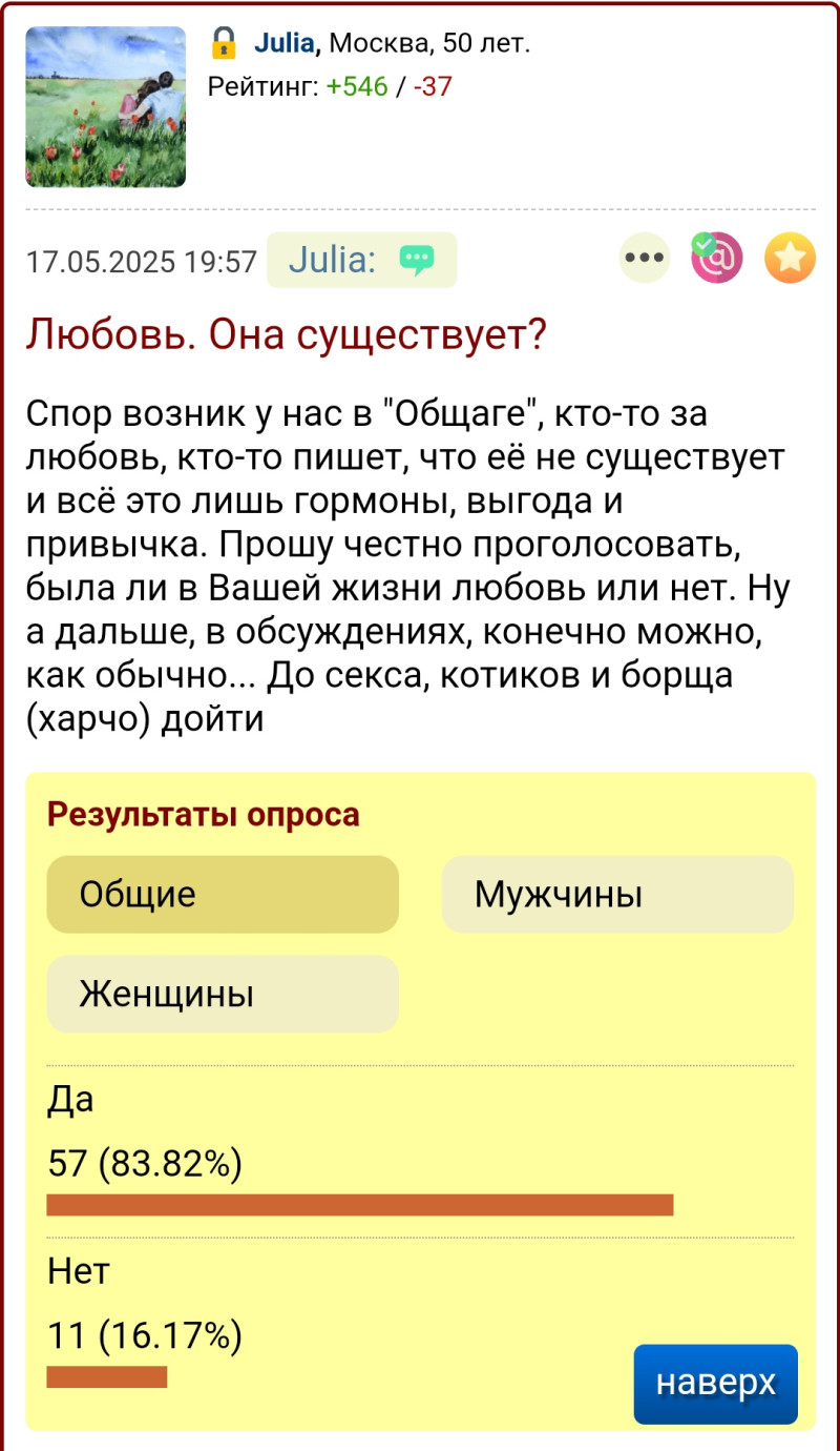 Итак, кто не видел результаты: Если даже не разбираться в терминах, большинство проголосовало, что любовь у них была. Значит, как минимум, они в неё верят.