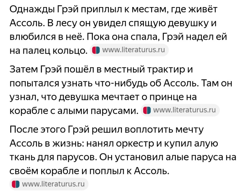 "Ребята, надо верить в чудеса! Когда-нибудь весенним утром ранним Над океаном алые взметнутся паруса, И скрипка пропоет над океаном. Не три глаза, ведь это же не сон. И алый парус, правда, гордо реет В той бухте, где отважный Грей нашел свою Ассоль, В той бухте, где Ассоль дождалась Грея." Грея! А не ежа