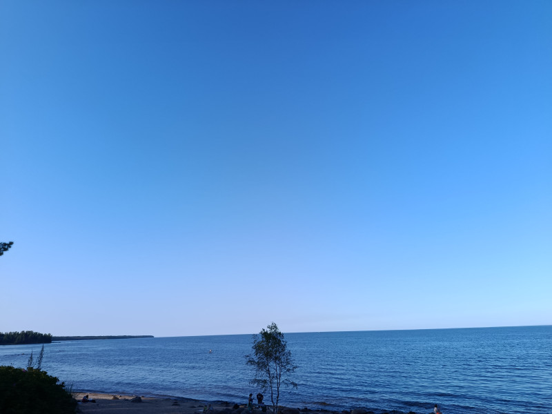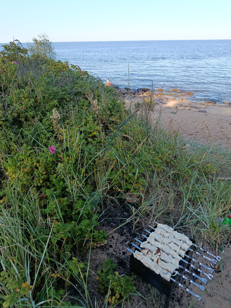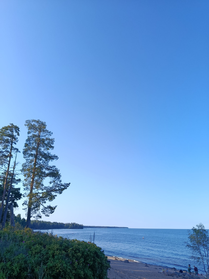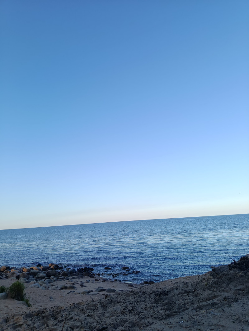 Это Ладога. Тепло, днём была жара, но мы вот только к вечеру доехали, был ветерок, теперь вот штиль. Народу много, многие с ночёвкой с палатками. Тишина и шум прибоя