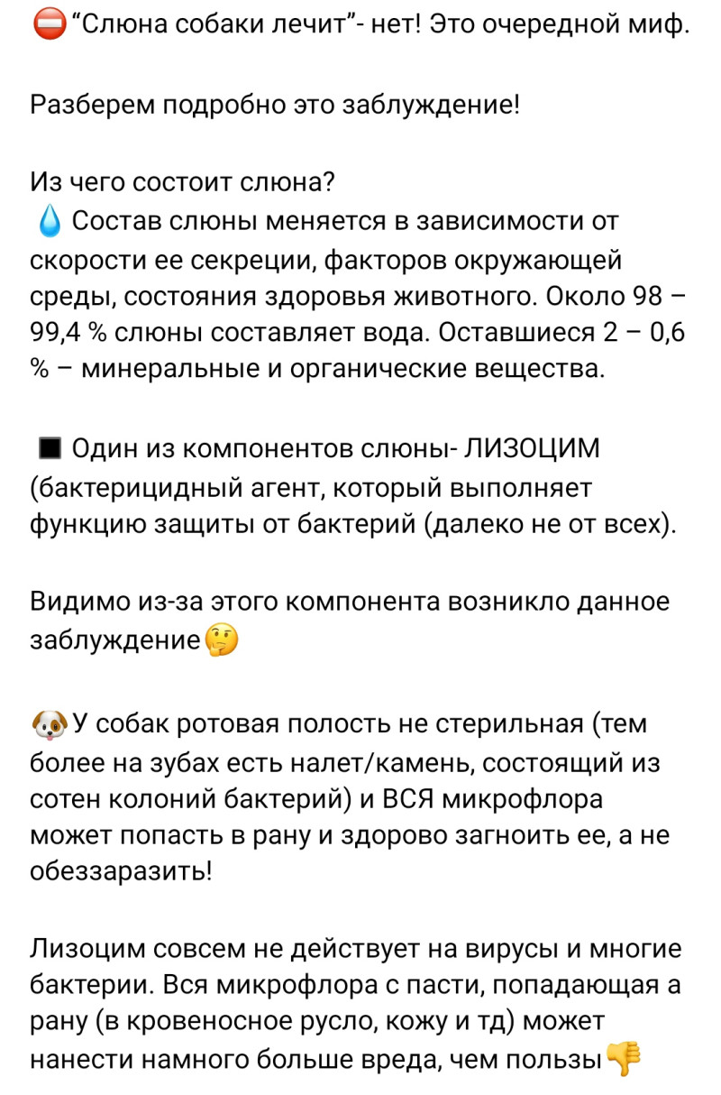 Я никогда не давала своим что-то зализывать... Знаю, что именно из-за слюны собачьи укусы плохо заживают. Сейчас вот поискала...