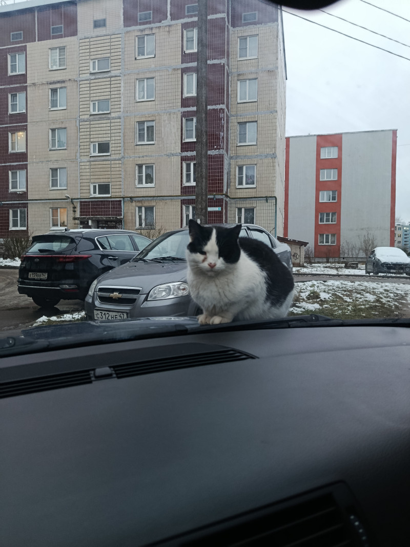 И котик, только припарковалась у магаза и он запрыгнул, погреться, так жалобно смотрел))