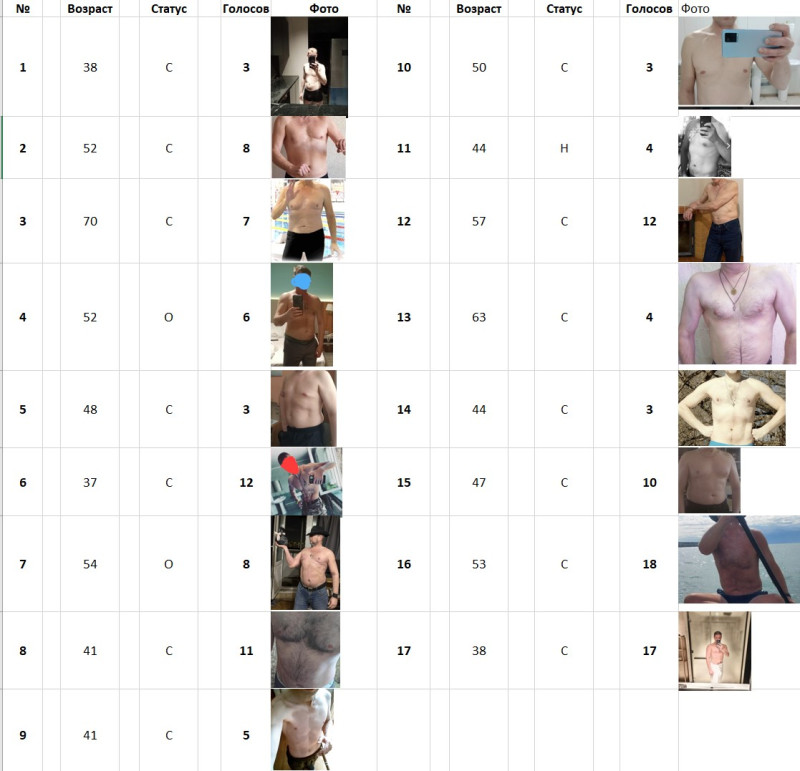 Естественно) поэтому такие конкурсы и не провожу. Понимаю, что Татьяне выбирать не приходится, хорошо что хоть такие прислали. Но... часть фоток которые уже были на форуме и значит плюсики могут ставить из-за симпатии или не ставить. Несколько столетней давности. Не в равных условиях мужчины. Ну, а к женатикам у меня особая "любовь" Вообще статус думаю лишнее. Просто границы возраста было бы достаточно.