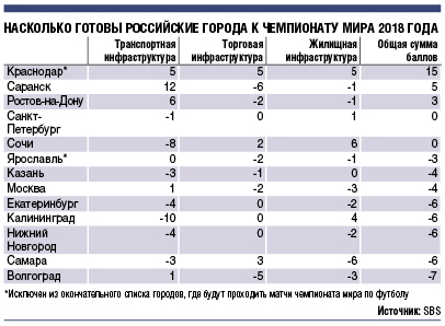/Что господин Ткачев специально всю сельхоз продукцию не отправляет в Питер и Москву, а только в другие регионы, т.к. питерскомосковские власти хотят нажиться нахаляву за счет Кубани.. Теперь о футболе!!! Приехали представители ФИФА и стали ездить по городам оценивая их.. Что они оценивали??? Аналитики из SBS сравнили готовность городов-претендентов к проведению чемпионата мира по футболу-2018 по трем критериям: развитие транспортной, торговой и жилищной инфраструктуры!! За каждый из трех вариантов давали баллы...Краснодар набрал 15 баллов