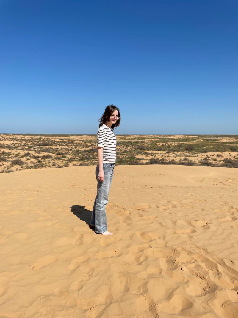 Мы были сегодня на самом большом бархане. Дочь стоит на его вершине. В песке встречается мелкая ракушка. Опустынивание идет, но после Узбекистана все кажется не таким ужасным.