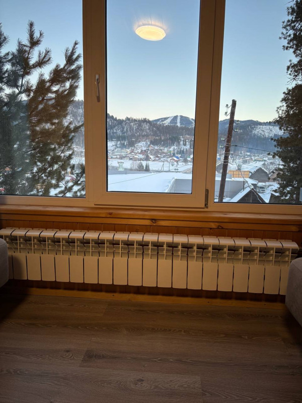 С гостиницы гору не видать, её закрывает другая гора.