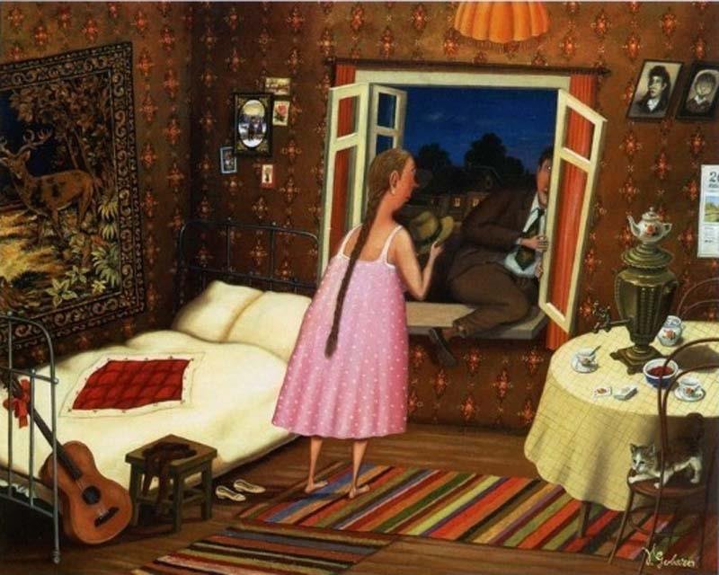 А мне понравилось из интервью и это почти в тему: "Обычно пишу быт, которого принято стесняться. Персонажи моих картин — простые люди. Они попадают в нелепые ситуации. Но карикатурности или сарказма не допускаю. Судя по книге отзывов с моих выставок, для посетителей очевидно, что я люблю своих героев. И это действительно так. Да, они не читали Гегеля и Канта. Зато бескорыстны, чисты сердцем. У них нет коммерческой жилки. Зато есть стремление к счастью. И по трупам они не пойдут"
