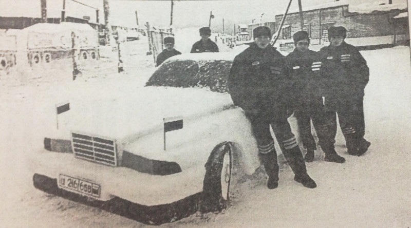 Это из снега авто. Рядом с ним зэки. Они сотворили это.