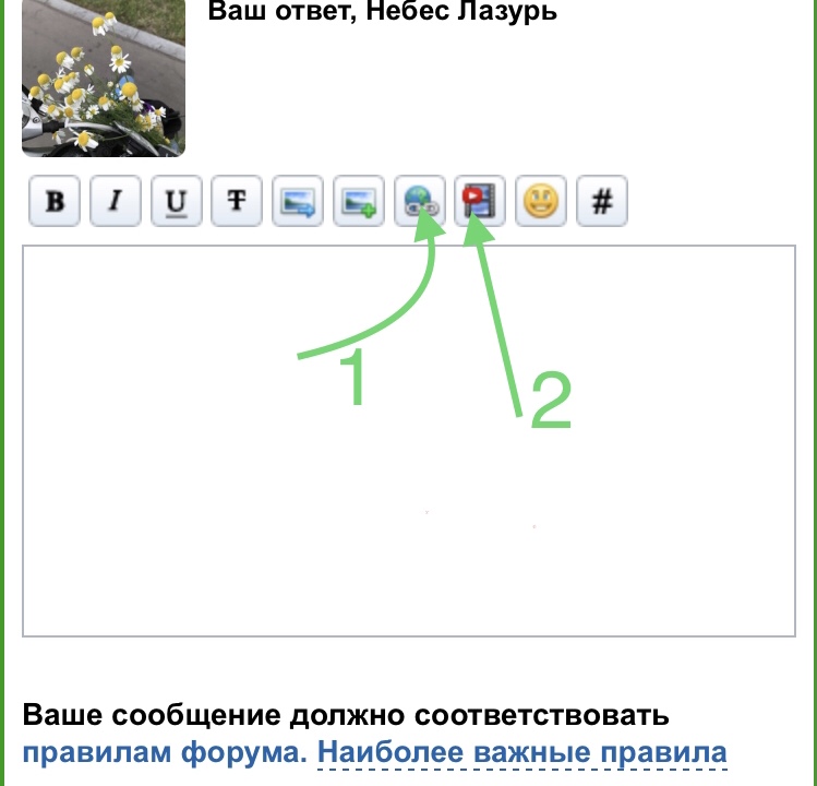 Кнопка1 - нажать, чтобы вставить активную ссылку на сайт. Кнопка2 - возможность выложить ролик с ютуба сюда. Любой удобный для вас вариант, Татьяна.