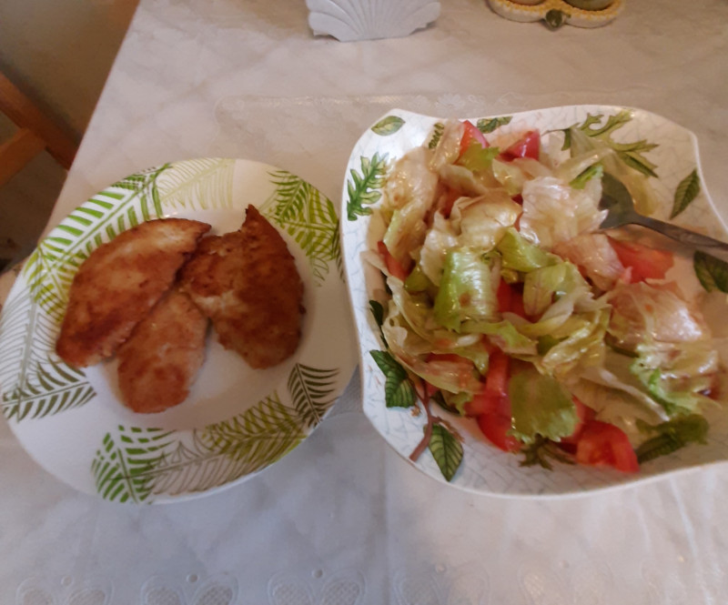Мой диетический обед: куриные грудки в панировке и гора салата айсберг с помидорами под гранатовый соусом.