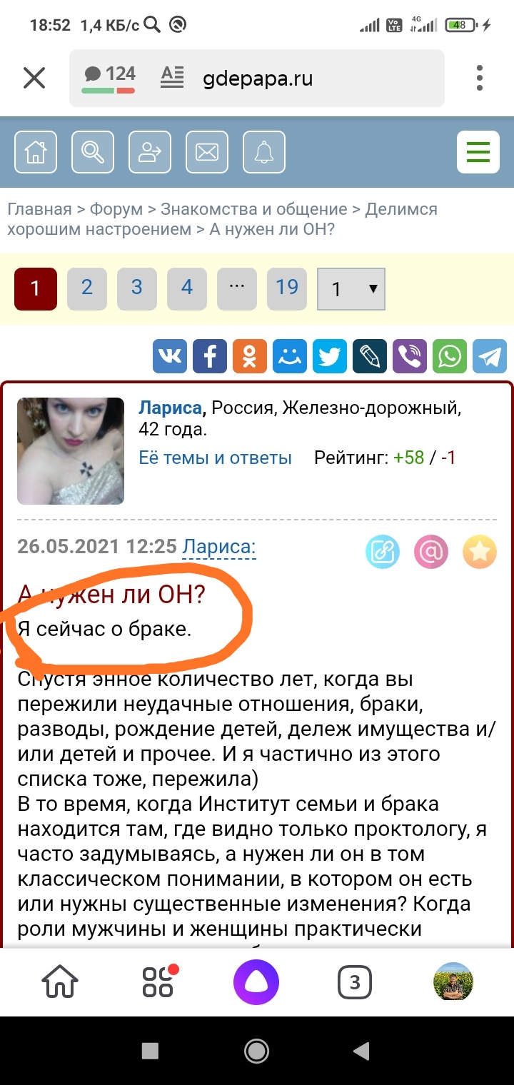 Я сейчас о браке. Спустя энное количество лет, когда вы пережили неудачные отношения, браки, разводы, рождение детей, дележ имущества и/или детей и прочее. И я частично из этого списка тоже, пережила) В то время, когда Институт семьи и брака находится там, где видно только проктологу, я часто задумываясь, а нужен ли он в том классическом понимании, в котором он есть или нужны существенные изменения? Когда роли мужчины и женщины практически сравнялись в плане добычи и сохранения очага/ухода
