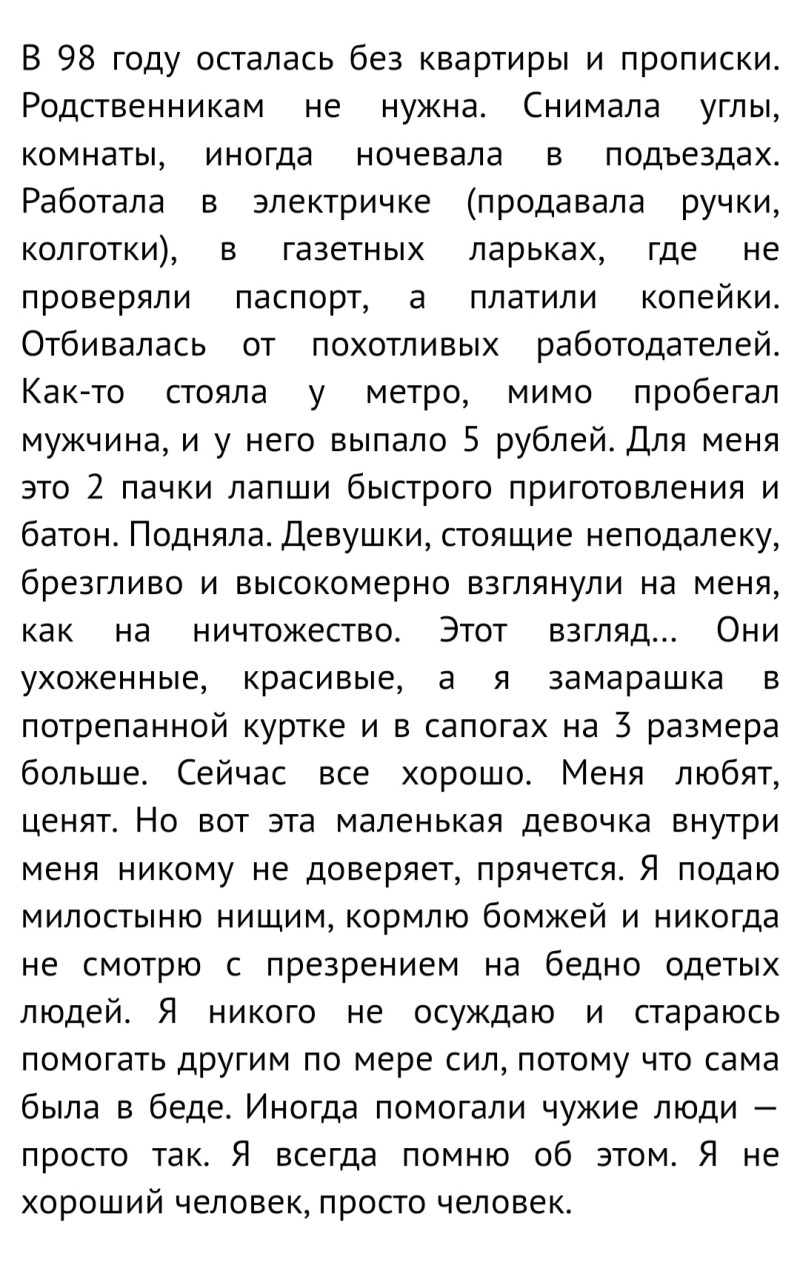 Мне история понравилась. Но нищим не подаю. Большинство из них алкаши, не желающие работать.