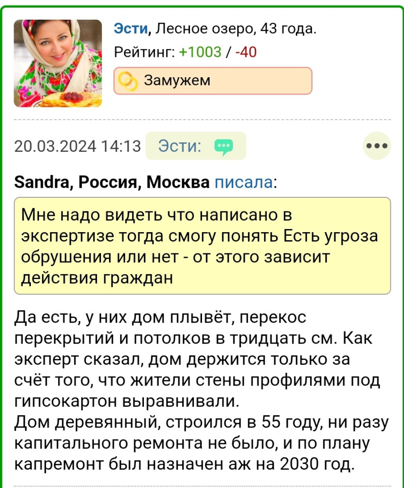 Да блин. Я пишу вроде по -русски, половина посёлка таких домов, и в каждом доме дети. Они как бы не совсем ещё падают, потолок не провисает, бывают и хуже дома. Ну кто и куда выселит сразу пол посёлка? И это в каждом населённом пункте так. Огромное количество домов надо расселять, и в райцентре так же. Куда всем деваться- то? С нашими чудесными деревенскими зарплатами? Потихоньку расселяют, старые дома сносят, но вот в нашем посёлке с 90-х годов был построен всего один новый дом. Когда б