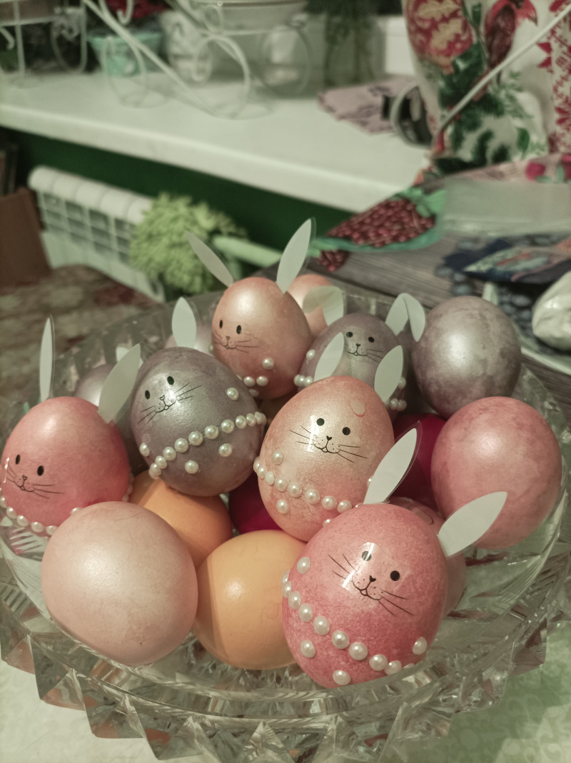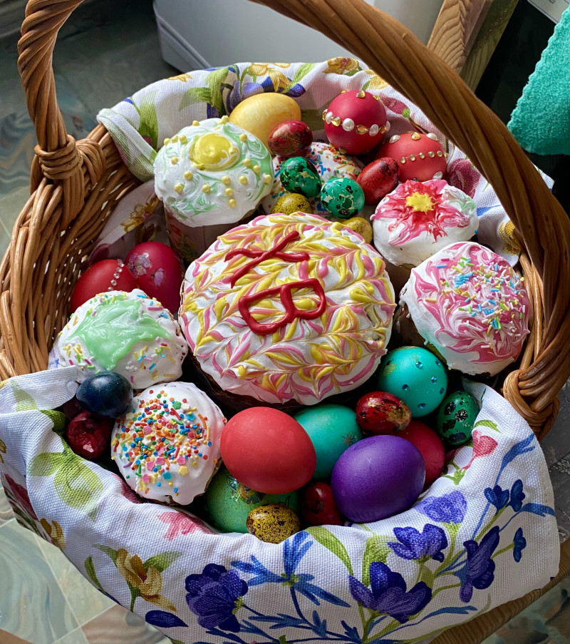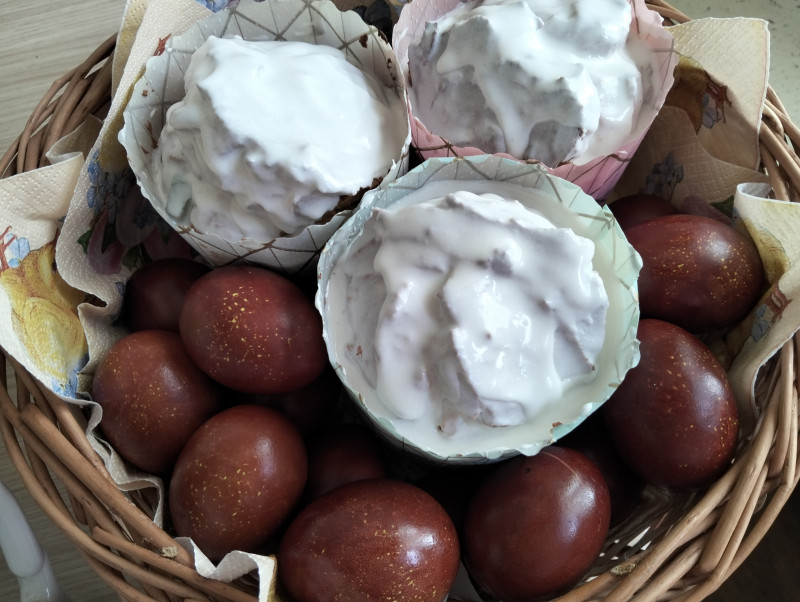 Мы только собираемся в церковь, ещё не освятили. Я пекла куличи, окрашиванием яиц Артём занимался)))