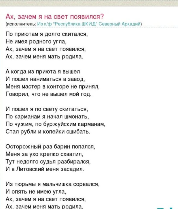 Я с утра решила, что нужно подтянуть на встречи с гдепапоповцами гитаристов и чтобы они знали песни моей юности, очень хочется вспомнить, что мы пели, когда учились... Итак.. Кино: "Восьмиклассница" Пустынной улицей вдвоём, с тобой куда-то мы идём, Я курю, а ты конфеты ешь. И светят фонари давно, ты говоришь: Пойдём в кино, А я тебя зову в кабак, конечно. М-м-м восьмиклассница a-a М-м-м Ты говоришь, что у тебя по географии трояк, А мне на это просто наплевать. Ты говоришь