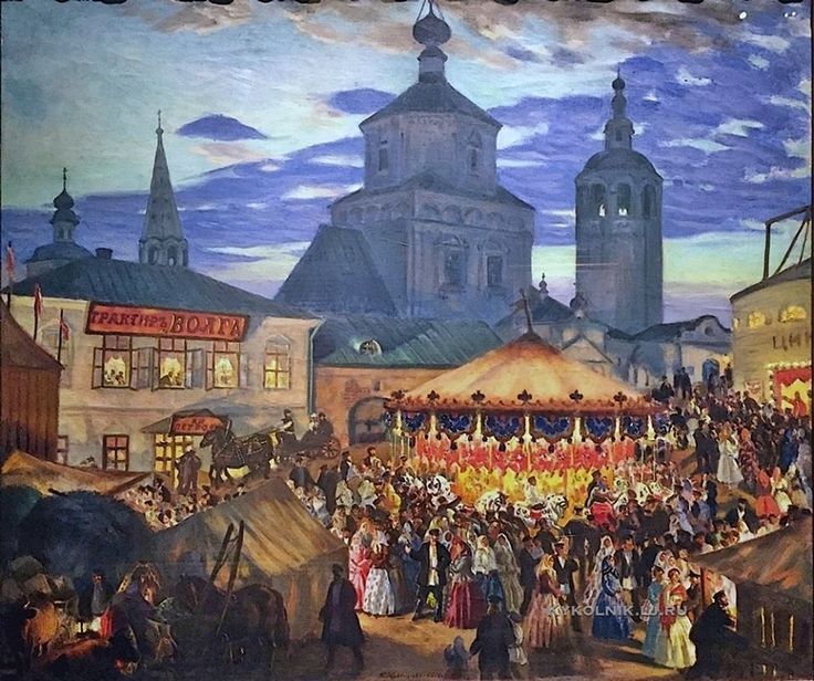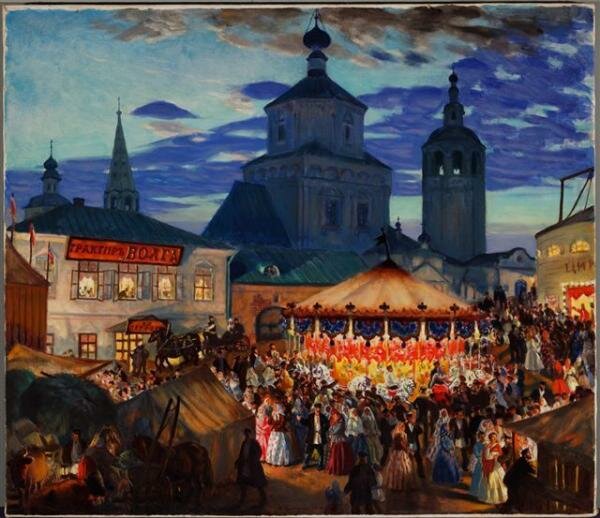 На первом плане — два старика, обсуждающие происходящее, сравнивающие прошлогодние ярмарки с нынешней.