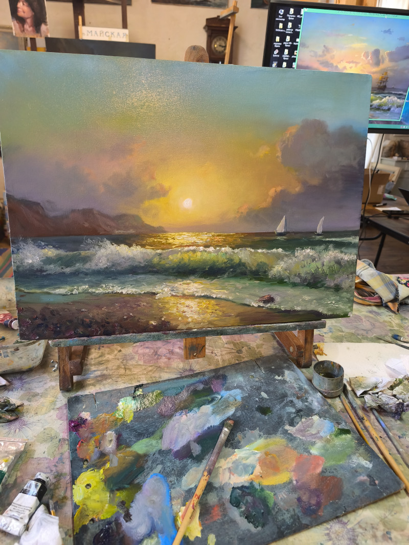 2, 5 часа рисовала В воскресенье приду ещё немного добавлю. Светлых пятен. Вот благодаря этому художнику море пишу