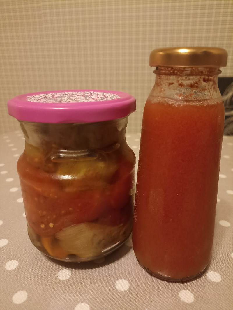 Кручу, когда дарят много овощей. Томатный сок в маленьких бутылочках , а в банке в собственном соку овощи: перец, помидора и баклажан. Перед закруткой их в духовке надо поджарить. Вкуснее будет, если на гриле приготовить. Ношу на работу, в обед ем)