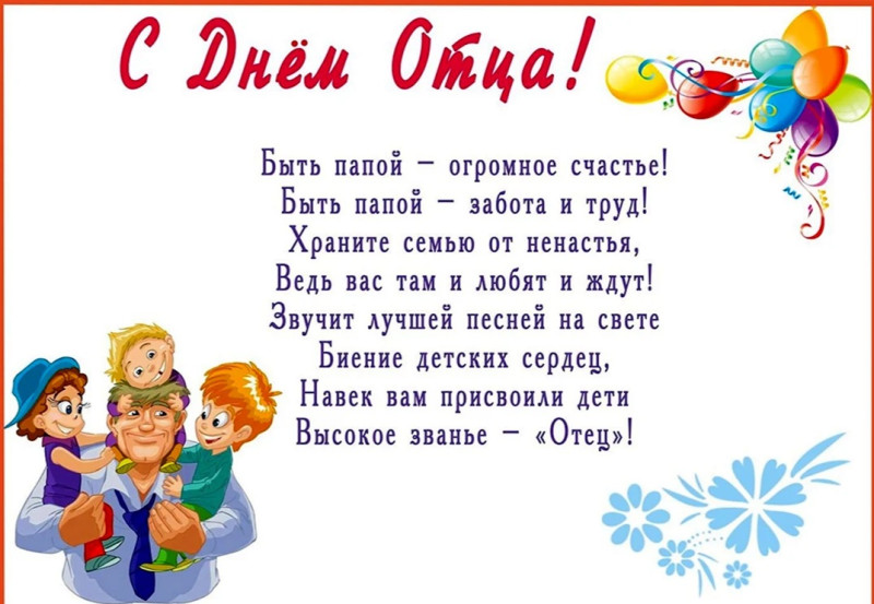 Поздравляю Вас с Днем отца! Пусть Ваша забота, поддержка и пример, вдохновляют самых родных и близких каждый день. Жизнь будет наполнена радостью, гордостью за детей и семейным теплом