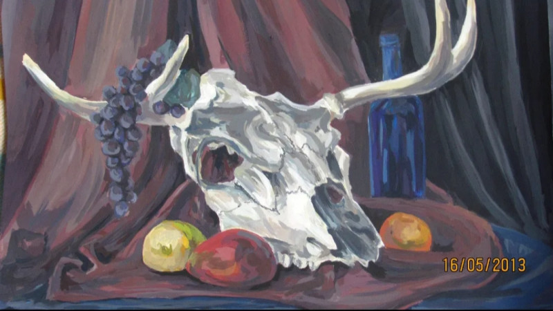Моя подруга попросила нарисовать ей кладбище, говорит мне нужна энергия смерти, какая-то планета пошла не туда, вообщем она сказала, что лучше картина, чем реальная смерть.. Но почему всё носят черепа на себе - я не знаю, тоже хотят напомнить окружающим, что мы смертны, наверное.. Пока живём - надо радоваться жизни, потом будем черепушками