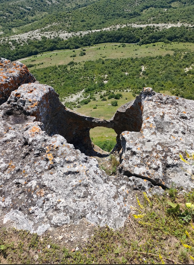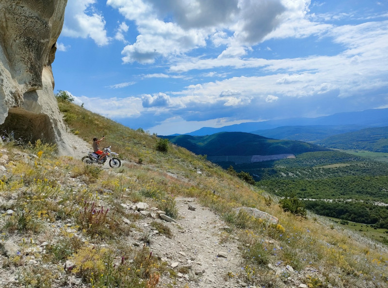 Ещё чуть дальше, на вершине горы находится древний город Тепе-Кермен. Я там никогда не был, когда-то давно проходил мимо, и вот спустя много времени, и увидев вершину, решил подняться и посмотреть. Выбрал дорогу, первый подъём норм, второй и третий тоже, на четвёртом двух метров до вершины не хватило. Тридцать минут и два кг потерянного веса и мокрый пошёл пешком, резина не злая, сноровки не хватает, ещё и страшно аж жуть. Дорога вверх осыпь, на четвереньках влез, а когда до вершины оставалось метров сто, меня обогнал чувак на эндуро, когда он спускался, я за него молился… Помогло (хотя тапочки он потерял). Сам (после прогулки) спускался крайне стрёмно.