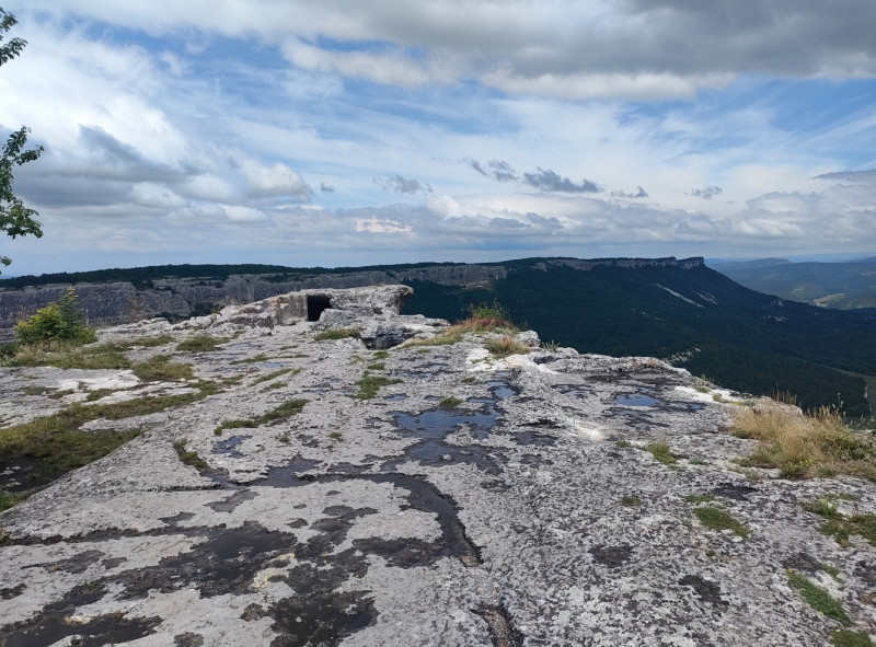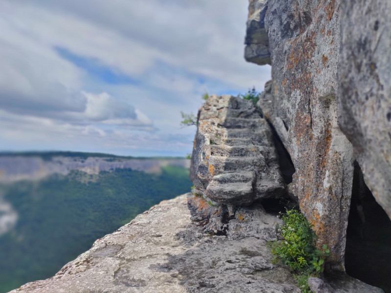 Были на Мангупе. Там сохранился резной вход из камня и символикой. Это была столица княжества Феодоро, которое было последним, в числе павших городов в Крыму. Его не могли взять очень долго, до последних живых защитников. И только когда объединились турки и татары, взяли измором, напали весной, не дали ничего посеять в долинах. Стволовая гора с очень отвесными стенами, можно долго держать оборону малым количеством людей.
