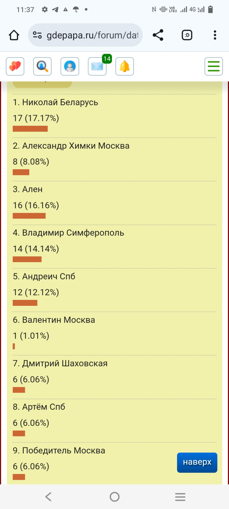 Подведем итоги 1 место Николай Беларусь 2 место Ален 3 место Владимир Симферополь Поздравляем победителей, вы самые приятные мужчины на форуме ГП 🎊💥🥳💪 Всем проголосовавшим спасибо