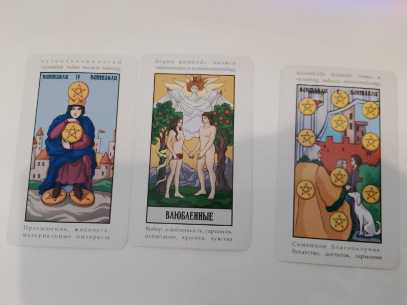 Ближайшее будущее может принести важные моменты выбора между отношениями и деловыми проектами и необходимостью защищать то, что уже достигнуто. 4 Пентаклей указывают на желание контролировать партнера. Но мне захотелось кинуть третью карту на отдалённое будущее в отношениях. И здесь, как видите, всё хорошо.
