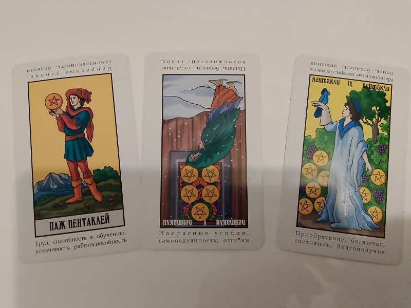 Смотрим первые две карты. Как я ни крутила.. Всё упирается в деньги. Паж пентаклей вытягивает ситуацию. Недостаток ресурсов компенсируется работоспособностью. Паж пентаклей также указывает на научные труды, которые скоро принесут результаты. Сложный период заканчивается. Прям в ближайшем ближайшем будущем новых отношений не показывает, но показан новый путь. 9 Пентаклей выпало на чуть более поздний срок, там да, есть хорошая перспектива отношений.