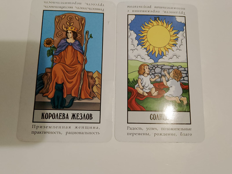 "Солнце приносит успех в проектах и делах, улучшение финансового состояния. Королева Жезлов представляет собой инициативность, лидерские качества и умение мотивировать команду. Такое сочетание говорит о том, что вы добьетесь блестящих результатов благодаря своему энтузиазму, решительности и позитивной энергии."