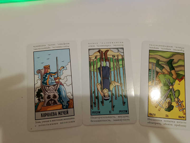 9 Жезлов говорит о необходимости защиты своих интересов, тогда как Королева Мечей подчеркивает необходимость ясного мышления и объективности в анализе ситуации. Это сочетание может говорить о том, что вам нужно оставаться решительным, несмотря на возможные преграды. Я спросила из-за чего всё? Третья карта показывает, что кто-то в вашей ситуации слишком хитропопый. Но придется взять себя в руки и пойти честным путём и трудом.