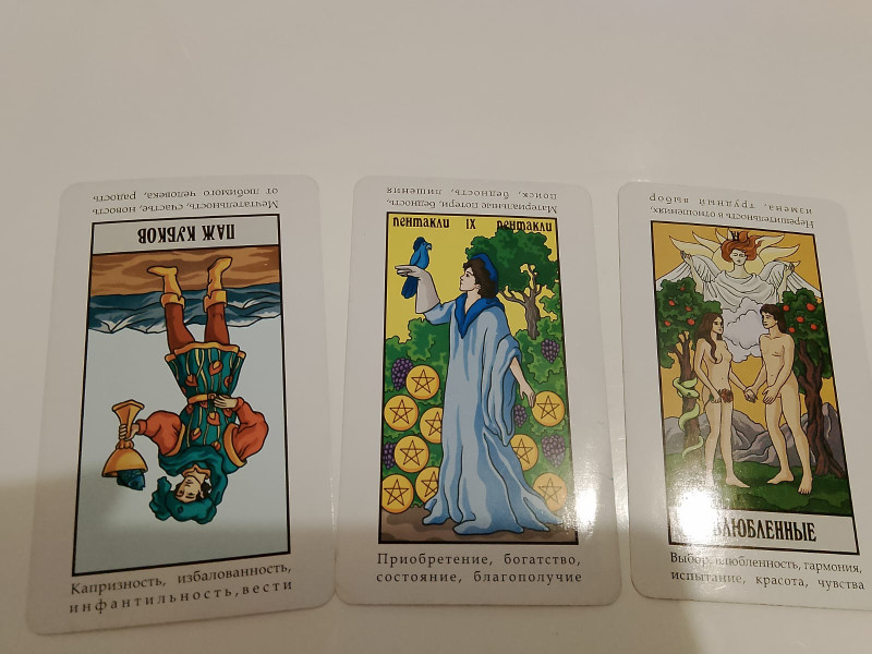 Паж Кубков в перевернутом виде может символизировать нереалистичные ожидания или идеализацию ситуаций. Если же партнёр есть, ощущение его неидеальности. Либо недовольство собой. В любом случае, это эмоции. В сочетании с Девяткой Пентаклей это может означать, что материальные достижения не приносят счастья. Девятка Пентаклей символизирует уверенность и комфорт в финансовом плане, однако вместе с перевёрнутым Пажом Кубков может предупреждать об изоляции.. Перевёрнутый Паж Кубков ставит под сомнение искренность эмоций, а Девятка Пентаклей указывает на стабильность и благосостояние.Далее можете сами, я могу видеть одно, Вы другое.
