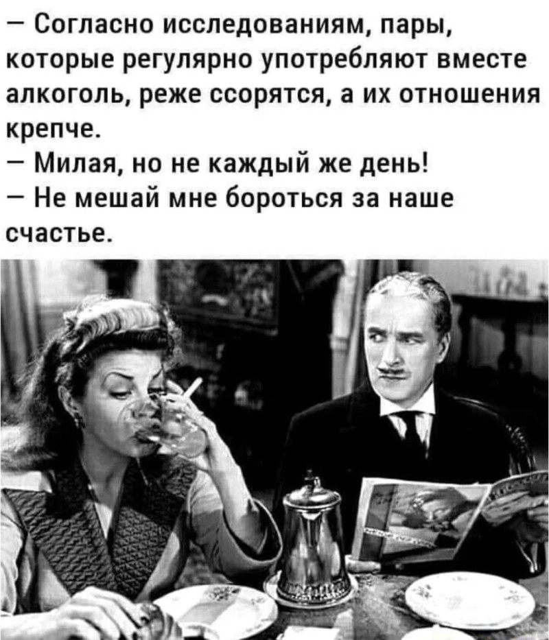 Совместимость алкогольных привычек пары является основным показателем стабильности брака — исследование. Выяснилось, что если один из партнёров употребляет спиртное гораздо чаще своей второй половинки, то такие отношения получаются менее стабильными. В самых гармоничных парах партнёры либо вообще не пьют, либо пьют вместе. Вот такое интересное исследование провели какие то очередные неизвестные учёные Я тут подумала 🤔 и решила.... По гороскопу мне никто не подходит, буду ис