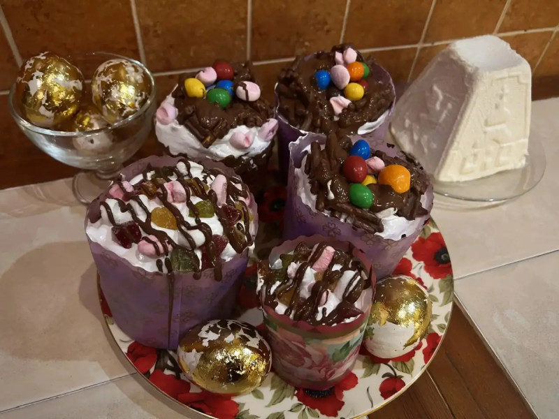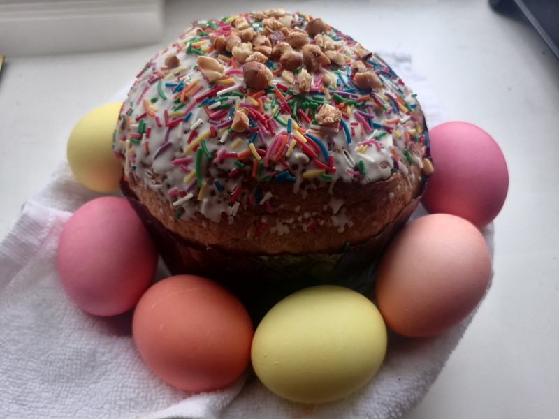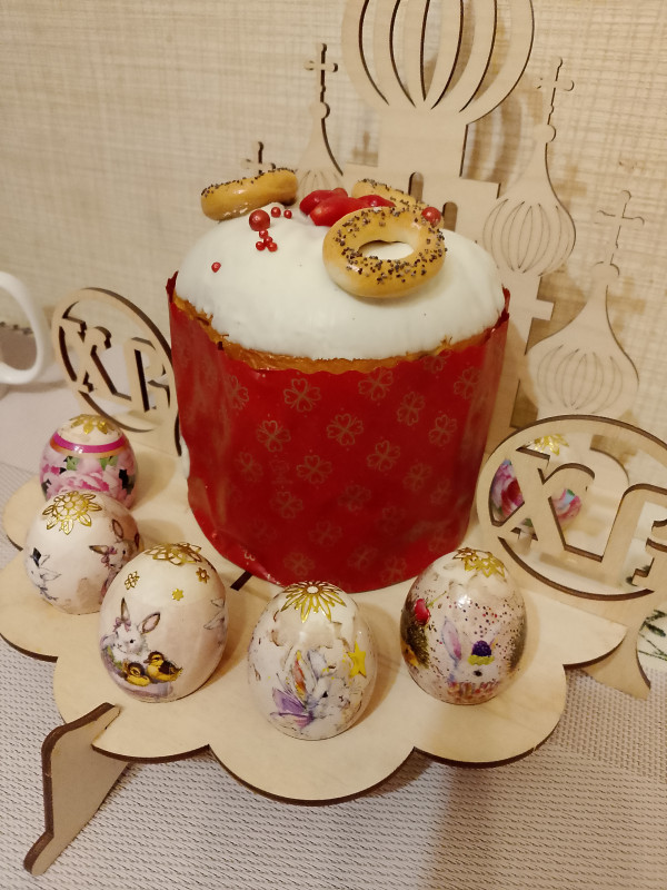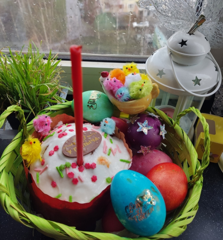 Я ничего не фотографировала) три кулича, 10 покрашенных яиц, бутылка кагора) сходили в храм со старшим сыном, освятили... Суета, толкотня, оголтелые бабульки сносят и сбивают с ног, будто места мало- всё, как всегда))) под дождь холодный попали