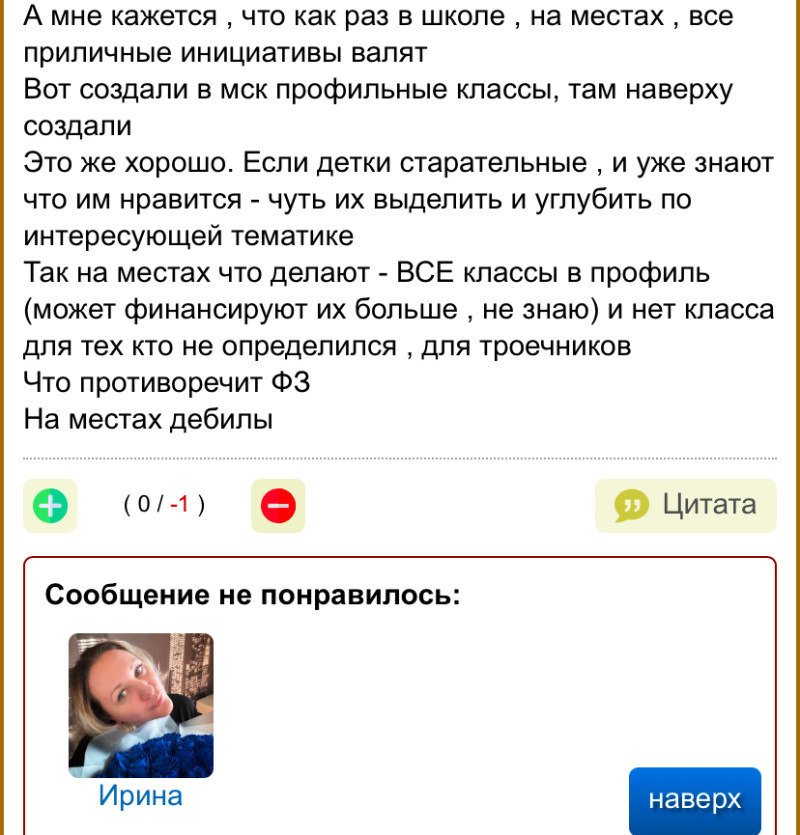 А мне кажется , что как раз в школе , на местах , все приличные инициативы валят Вот создали в мск профильные классы, там наверху создали Это же хорошо. Если детки старательные , и уже знают что им нравится - чуть их выделить и углубить по интересующей тематике Так на местах что делают - ВСЕ классы в профиль (может финансируют их больше , не знаю) и нет класса для тех кто не определился , для троечников Что противоречит ФЗ На местах дебилы