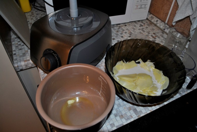 300 гр. картофеля режем в комбайне слоями по 2 мм толщиной.