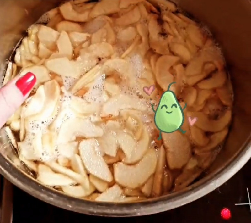 По прошествии этого времени, варим груши минут 10 — 15 после закипания, хорошо вымешивая ложкой, чтобы не пригорело и снимая пену. Если груши твердые осенние — то надо увеличить время варки до 30 минут.