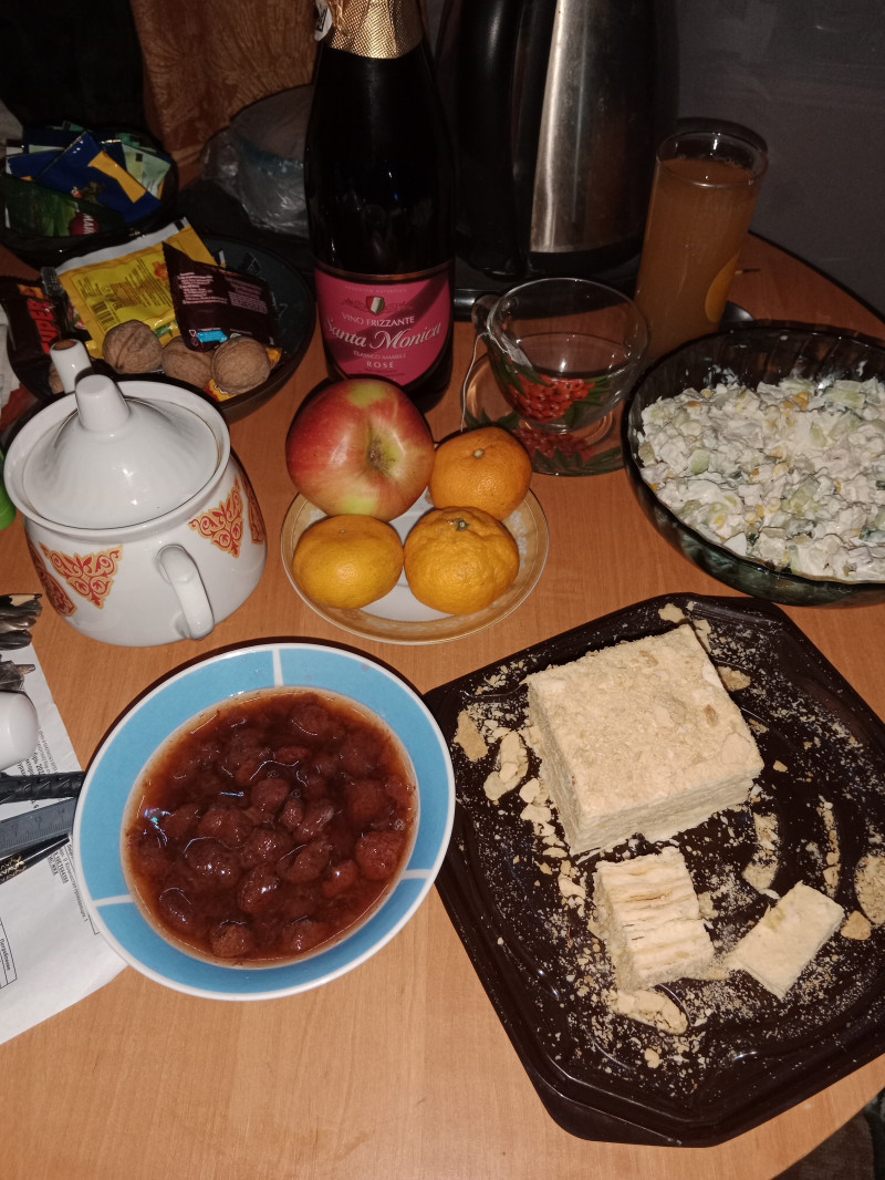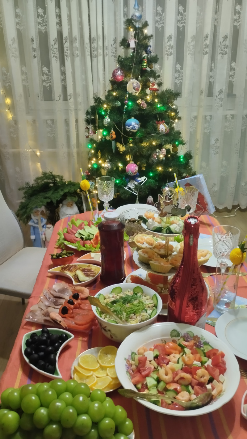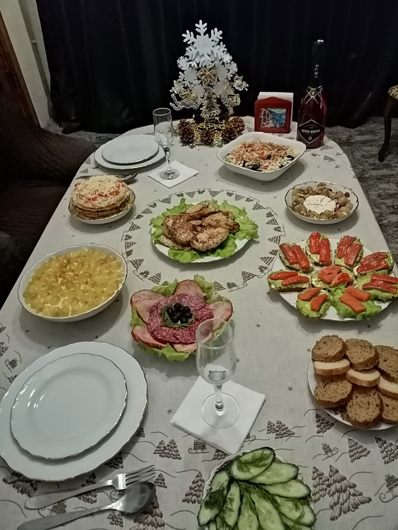 Мы днем съездили к старшему поколению, их поздравили - там и поели много и вкусно первый раз! Второй раз будет разумно и под бой курантов. Дальше пойдём гулять ночью.